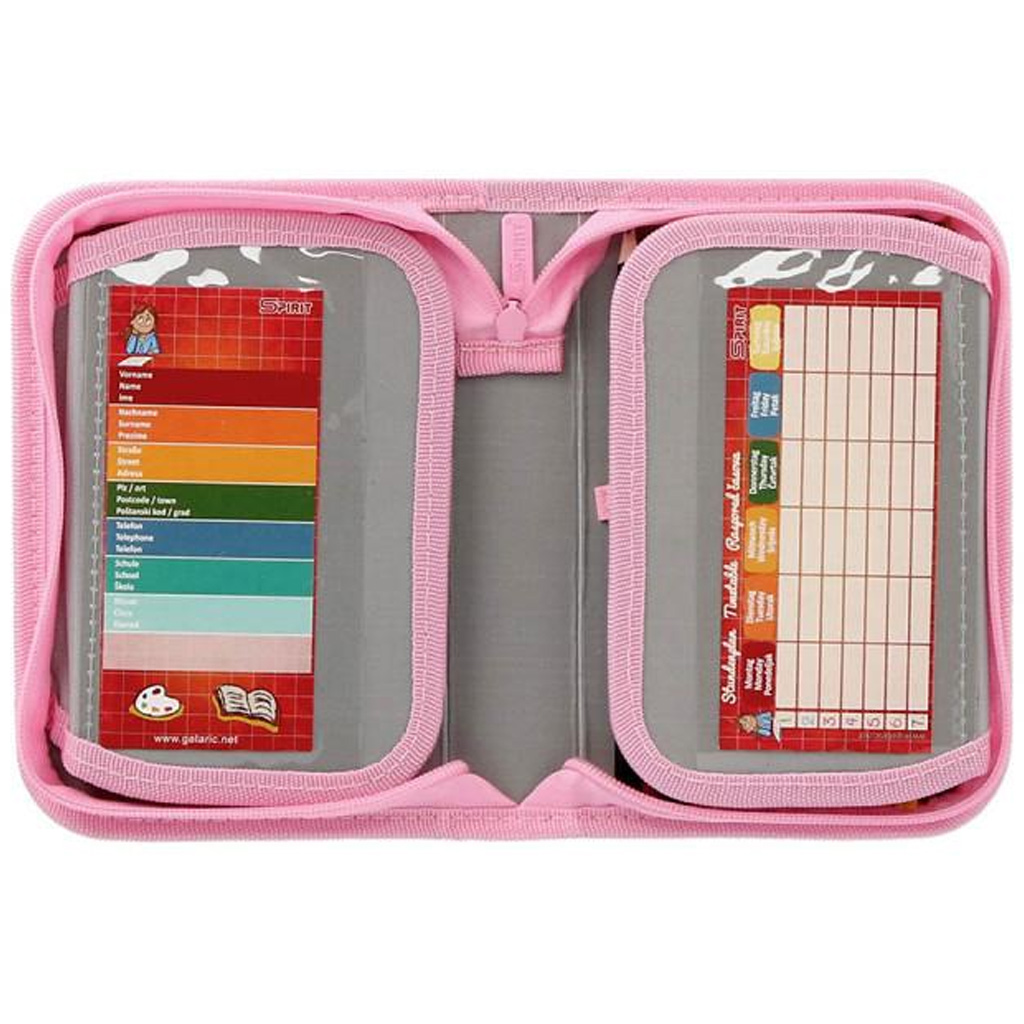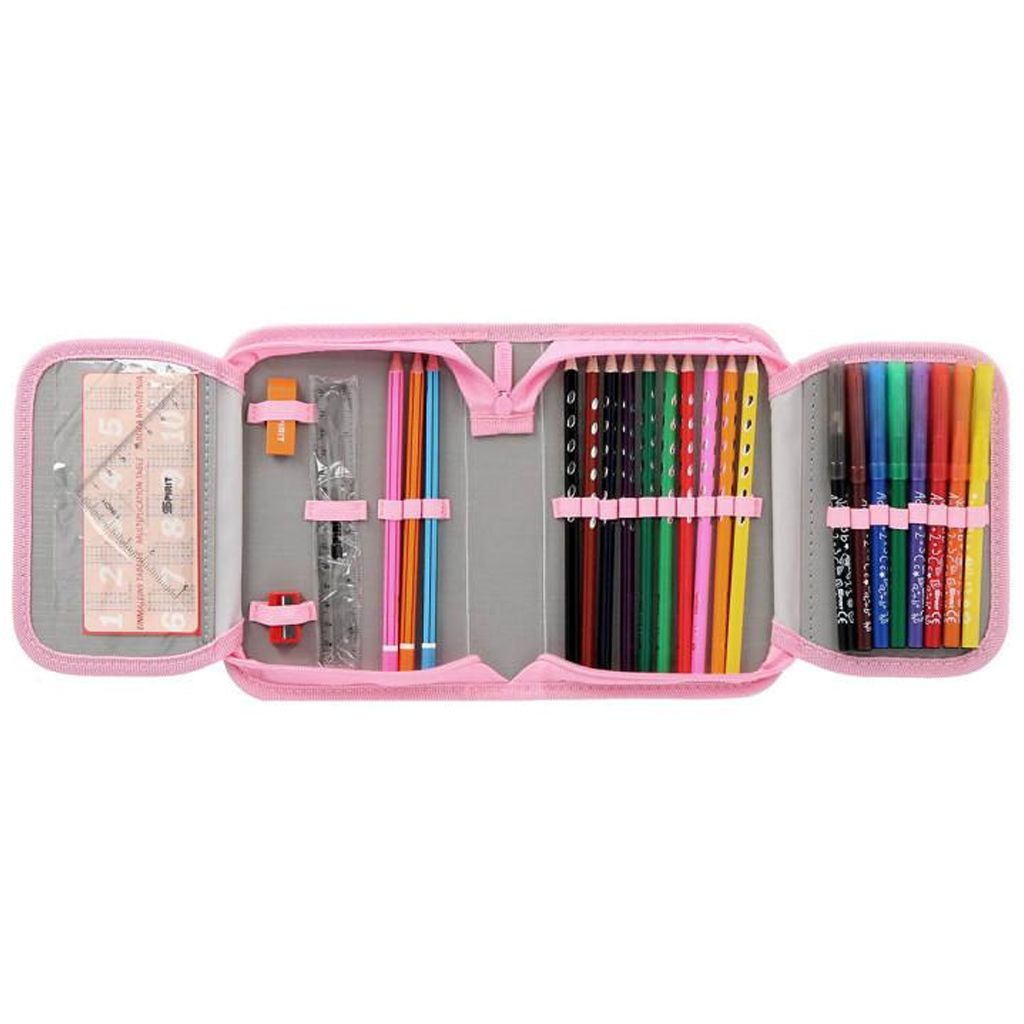 Ez a tolltartó 1 cipzárral zárható és kihajtható kivitelű, így könnyen átlátható és jól rendszerezhető. Belsejében 28 darab praktikus írószert rejt, amelyek minden szükséges eszközt tartalmaznak a tanórákhoz: grafitceruzák, színes ceruzák, filcek, radír, hegyező, vonalzó, háromszög, valamint órarend, névcímke és egy szorzótábla is helyet kapott benne. Mindezt erős gumipántok rögzítik, így minden a helyén marad, még a sietős iskolai napokon is.