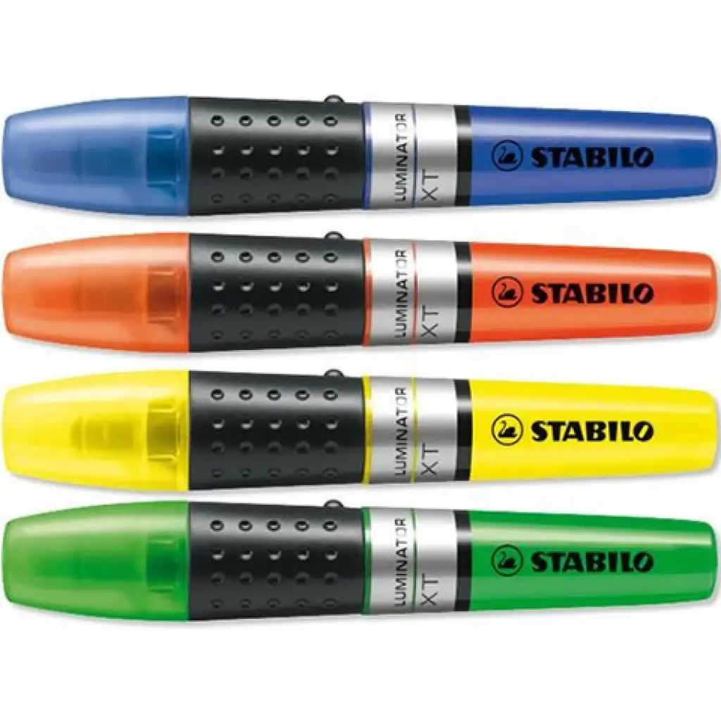 Egy praktikus asztali tárolóval együtt érkezhet írószer gyűjteményedbe 4db kiváló minőségű Stabilo Luminator XT szövegkiemelő, amely nagyban megkönnyítheti a munkád akár az irodában, akár az iskolai mindennapok során. A különböző színek használata hozzájárul, hogy a fontossági sorrendet szín szerint is megjelöld a tanulmányaid, munkád során. A nagy méretű tinta tartálynak köszönhetően hosszú ideig használható és rengeteg fontos információt emelhetsz ki segítségével. Az ergonomikus markolatnak hozzájárul a kényelmes használathoz és megkönnyíti a dolgod, hiszen pontosan húzhatod ki azokat a sorokat, amelyekre később szükséged lehet.