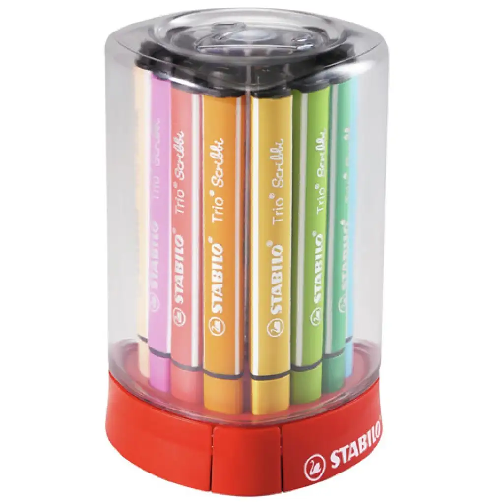 Ez az asztali filctoll készlet ideális választás, hiszen tucatnyi filctollat tartalmaz amelyek egy igen praktikus tárolóban érkeznek, így egyszerűen az asztalon tárolva mindig kéznél lesznek, és ha minden használat után visszakerülnek a tárolóba, garantáltan nem fognak elkallódni az egyes darabok. A Trio Scribbi filctoll ideális választás a gyerekek számára, hiszen a vastagabb és háromszögletű kialakítás nagyon kényelmes fogást kínál a kicsi kezek számára. A strapabíró rugós kialakítású hegy pedig szinte kitörhetetlen így a gyerekek bátran rányomhatják a papírra.