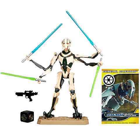 A Star Wars Grievous tábornok figura mellett a készlet tartalmaz fegyvereket, karakterkártyát, állványt és egy dobókockát is.