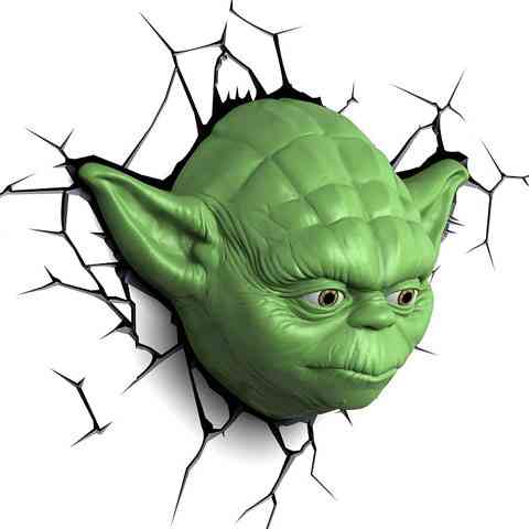 A híres Yoda Jedi mester most a te szobádban is feltűnhet különleges háromdimenziós LED lámpa formájában. A halvány zöldes fényének köszönhetően lágy irányfényt biztosít a vak sötétben, integrált időkapcsolója segítségével a világítás 30 perces vagy egész éjszakás intervallumban állítható. A felszereléséhez csupán 2db csavar és 2db tipli szükséges, nem kell kábelt vezetni és falat vésni a beépített elemes energiaforrásnak köszönhetően. A lámpa köré ragasztható faltörést imitáló matrica még élethűbb érzetet kelt. A LED izzók élettartama kb 50.000 óra, nem melegszik így biztonságos használatot biztosít akár egész éjszaka.