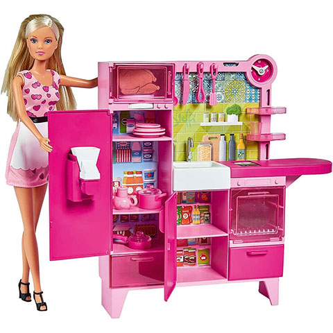 Steffi Love baba nem csak a divat tekintetében jár élen, hanem az otthoni háztartásból is kiveszi a részét, mégpedig egy ilyen remekül felszerelt konyha segítségével. A konyhapultban a kislányok mindent megtalálnak a jégkockakészítőtől a forgótányéros mikrohullámú sütőig. A játékot ráadásul megannyi apró kiegészítő teszi teljessé. A harminc centiméteres, hosszú fésülhető hajú Steffi Love baba megfelel a legtöbb hasonló divatbabának, így a kislányok más, hasonló méretű babának a ruháját is feladhatják rá, ráadásul más játékszettek kiegészítőivel is remekül használható. A baba önmagától nem képes megállni a saját lábán.