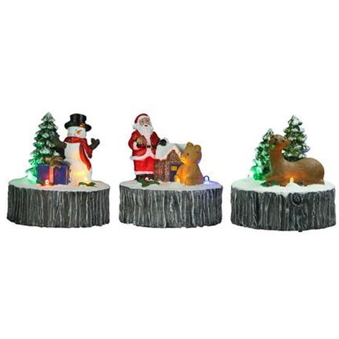 Válassz egyet a három különböző karácsonyi figura közül és biztos lehetsz benne, hogy a kis figura igen sokat fog hozzátenni az ünnepi hangulathoz. A három különféle figura mindegyike klasszikus téli, karácsonyi hangulatot áraszt magából. Az egyik egy őzgigát, a másik egy mókás hóembert, míg a harmadik magát a Télapót ábrázolja. Mindegyik figuracsoport egy fatönk szerű talapzaton kapott helyet, ami természetesen a havas borításával még inkább hozzájárul az ünnepi hangulathoz, akárcsak a kis fényforrások, amelyek kellemes melegséget kölcsönöznek a díszeknek.