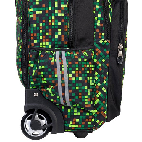 A Gamer egy igazán elegáns és vagány iskolatáska, ami mindemellett nagyon lányos, és mutatós, köszönhetően a Minecraftot idéző zöld és barna színeknek, ráadásul a kerekes kialakítás megkímélheti a gyerekek hátát, hiszen akár maguk után is húzhatnak. A táska párnázott kialakítású hát részének, valamint az állítható és széles vállpántoknak köszönhetően a gyerekek számára kényelmes, ugyanakkor a pántok egyszerűen elrejthetőek, amikor a gurulós funkciót használjuk. A minőségi, vízálló anyagból készült iskolatáska a tárolásban is praktikus, hiszen több nagy rekesszel és cipzáras zsebbel is rendelkezik a könyvek és füzetek számára, valamin egy bélelt külön belő rekesz egy notebook részére. Végül de nem utolsó sorban igen hasznosak a biztonságot nyújtó fényvisszaverő minták, valamint a kihúzható fogórész, aminek a segítségével a csapágyazott gumikerekeken lehet húzni a táskát.