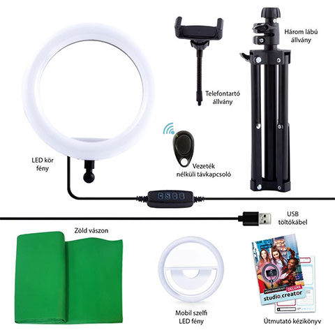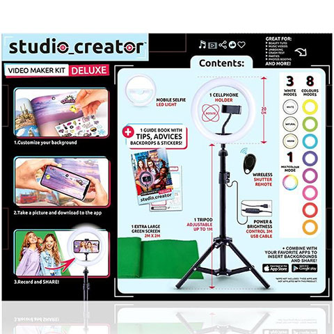 A Studio Creator Deluxe Videokészítő készlettel bárki könnyedén készíthet profi videókat és szelfifotókat. A zöld hátteres technika segítségével a videóra, fényképre bármilyen háttér odavarázsolható, a 12 színű LED körlámpa pedig igazi kreatív szabadságot nyújt az alkotáshoz. A csomagban található készlet használatához egy könnyen követhető kezelési útmutató is található, ami pillanatok alatt mindenkiből profi videóst varázsol. A Videokészítő készlet a legtöbb okostelefonnal kompatibilis, ráadásul a csomag legtöbb részének egyéb helyzetekben is hasznát lehet venni.