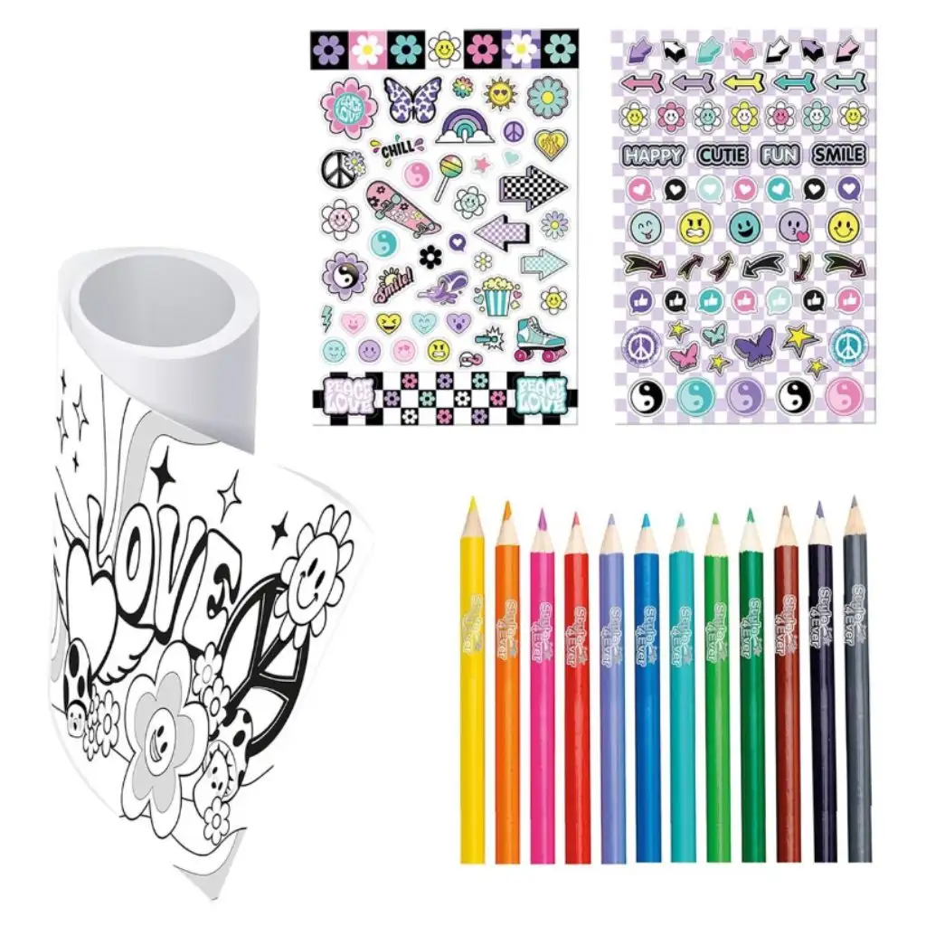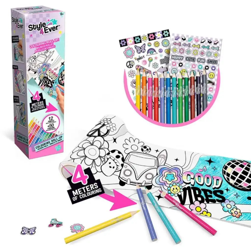 A Style 4 Ever dekorálható tekercsposzter tökéletes választás, ha szeretnéd feldobni a gyerekszoba üres falait és szabadjára engedni a kreativitásodat! A dobozban egy 4 méter hosszú posztert találsz, tele izgalmas, lányos mintákkal, ábrákkal és sziluettekkel, amelyeket kedvetekre színezhettek. A csomaghoz 12 élénk színű ceruza is jár, hogy a posztert igazán színpompássá tegyétek. A sárga, piros, kék, zöld és további színek kavalkádja garantáltan leköti a gyerekek figyelmét, és minden színező álma valóra válik vele. A poszterhez 50 szuper matrica is tartozik, amikkel még látványosabbá tehetitek az alkotást. Plusz, a poszter különleges részeire baráti fotókat ragaszthattok, vagy motiváló üzeneteket írhattok, így igazán egyedi dekoráció válik belőle.