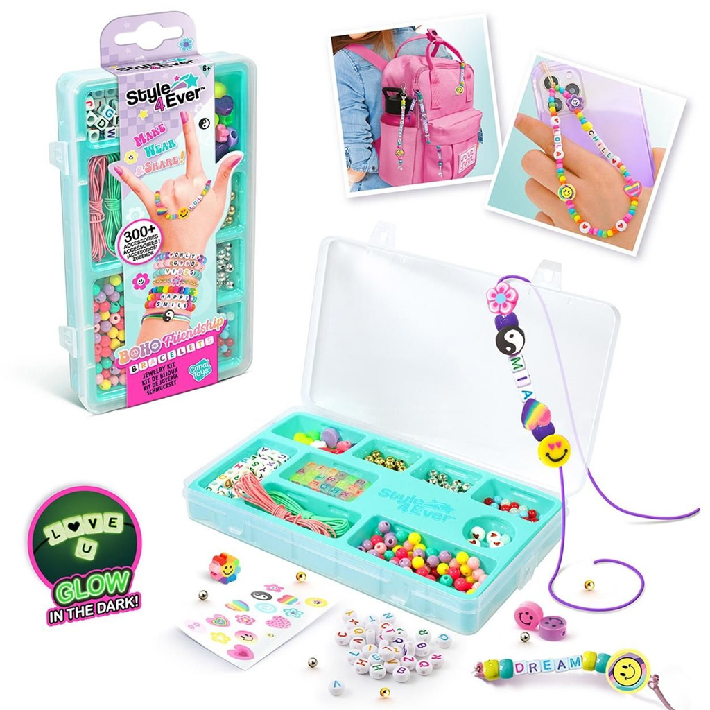 Ha szereted az egyedi ékszereket és örömmel készítesz személyes meglepetéseket barátaidnak, akkor a Style 4 Ever Boho barátságkarkötő-készítő mini készletet nektek találták ki! Ez a kreatív szett több mint 300 darab színes gyöngyöt, betűgyöngyöt, szalagot, zsinórt és díszítőelemet tartalmaz, így könnyedén készíthettek saját nevvel ellátott karkötőket, kulcstartókat vagy táskadíszeket.