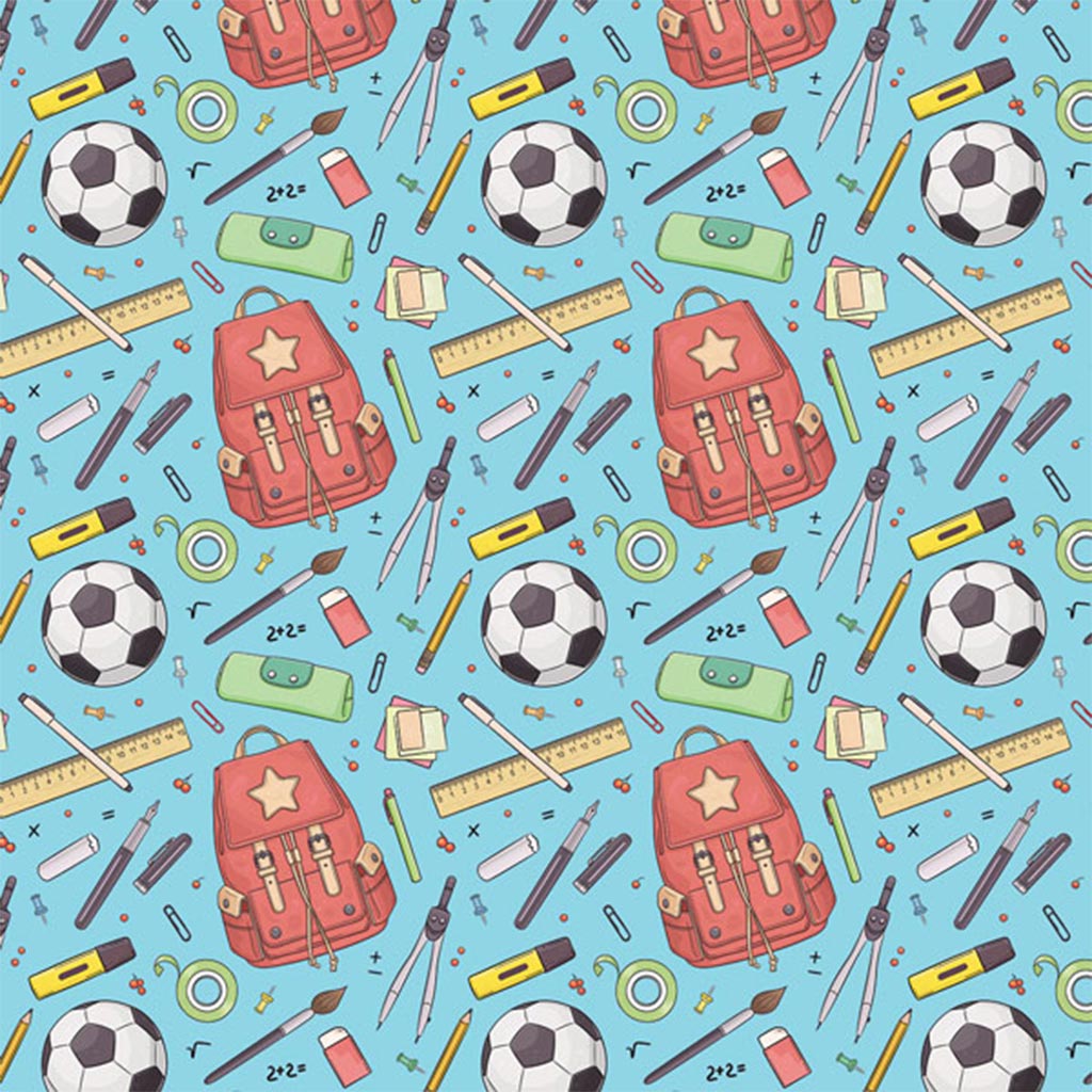 Focilabdás és iskolai eszközös, kézzel rajzolt hatású minta