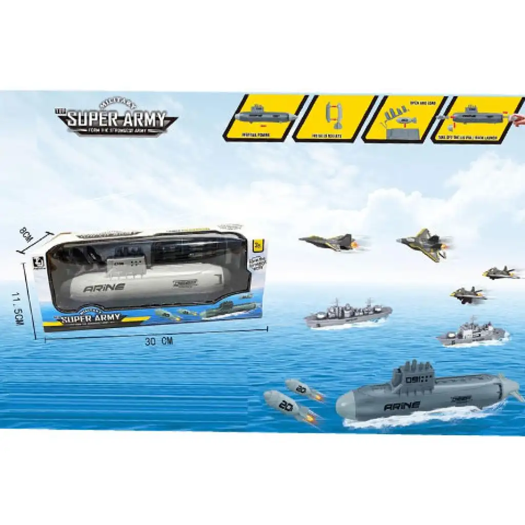 A katonaság rengeteg különböző járművel rendelkezik, melyek közül most egy tengeralattjáró lehet gyermekedé. A tengeralattjáró részletes kialakítást kapott, tetején keresztül pedig bele lehet helyezni a szettben lévő rakétákat. Miután ez megtörtént, a hajó hátsó rotorjait kihúzva, ki lehet ezeket lőni. A tengeralattjáró nagyon strapabíró, így sokáig lehet majd használatban és párban akár csatákat is lehet vívni egymással. Szerezd be és keresd egyéb játékainkat is kínálatunkban.
