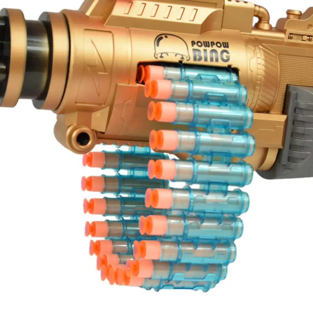 A fegyverbe egy szétszedhető tárral lehet behelyezni a töltényeket, melyekből összesen 30 db található meg a szettben, a fegyver pedig egy 5 lyukú forgó fegyvercsövön keresztül lövi ki akár 11 méteres távolságba a lövedéket, hogy még izgalmasabb legyen a játék. Könnyen újratölthető és akár plusz töltényeket is találhatsz kínálatunkban hozzá.