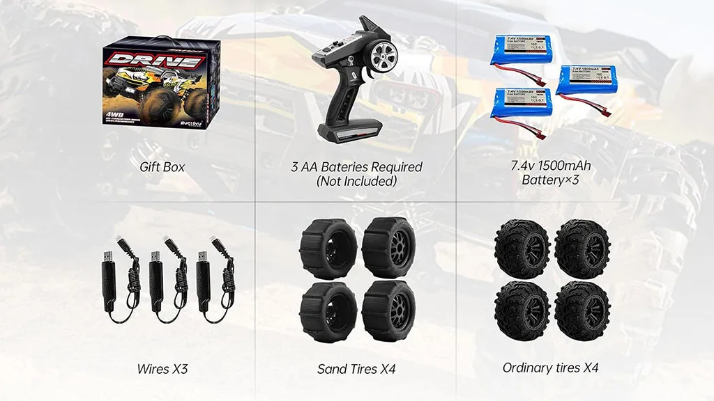 Ez az 1:16 méretarányú összkerékhajtású R/C Monster Truck úgy van kialakítva, hogy könnyedén megbirkózzon a rögös tereppel, és képes driftelni, pörögni és ugrani. A kefe nélküli motor 47 mph-s csúcssebességre gyorsítja. 2.4 GHz-es ravaszstílusú vezérlővel rendelkezik, és homoktípusú abroncsokkal érkezik, amelyek hóban is használhatók. Három akkumulátorral és három töltővel együtt érkezik, lehetővé téve, hogy a kocsi akár egy órán át is működjön (20 perc akkumulátoronként). Tartozékok között megtalálható egy miniatűr csavarhúzó, egy villáskulcs és további alkatrészek.