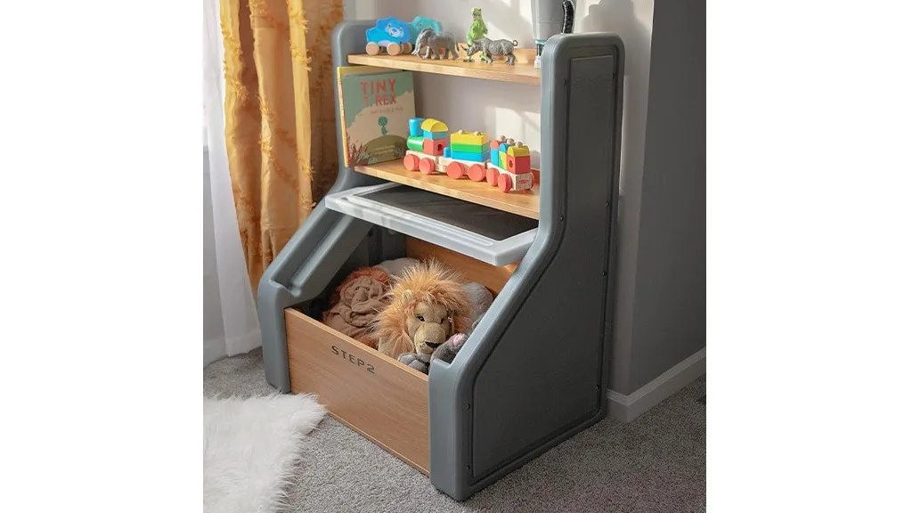 Ez a Step2 tárolódoboz fa és műanyag keverékéből készült, és úgy tervezték, hogy minden gyermek igényeit kielégítse a különböző korosztályokban. A doboz jellemzői közé tartozik egy nagy alsó tároló, valamint polcok könyvek és játékok tárolására.