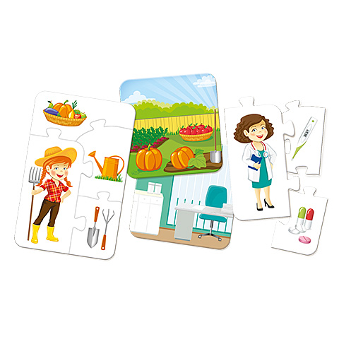 A legkisebbek is könnyen megismerkedhetnek az egyes szakmákkal, foglalkozásokkal a játék során, mellyel így ismereteiket is szélesítik. Az összeilleszthető puzzle elemekkel mindig egy szakma eszközeit, alkalmazási helyeit illeszthetik össze, így kapva teljes képet az orvosi, vagy épp a mezőgazdasági foglalkozásról. A kártyák elkészítésével nem csak a kicsik logikája fejlődik, de ismereteik is bővülnek.