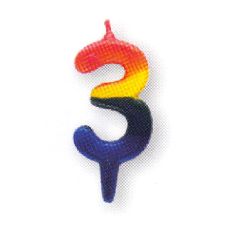 A tarka, kék, sárga és piros csíkos, számokat ábrázoló gyertya figyelemfelkeltő dísz egy évfordulós, szülinapi tortára. A gyertya saját anyagából készült meghosszabítás teszi lehetővé, hogy a gyertyát a tortába biztonsággal bele lehessen szúrni. A számok egyenként rendelhetők, emiatt variálhatók. A hármas szám a kapcsolatteremtés, kommunikáció, és egyben a büszkeség száma is.