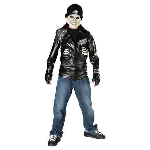 A szett tartalmazza az ijesztő koponya maszkot, melynek a sapka is a része, valamint a szegecsekkel és láncokkal díszített kabátot és a szegecsekkel kirakott kesztyűket. Legyél te a legmenőbb a jelmezbálon!