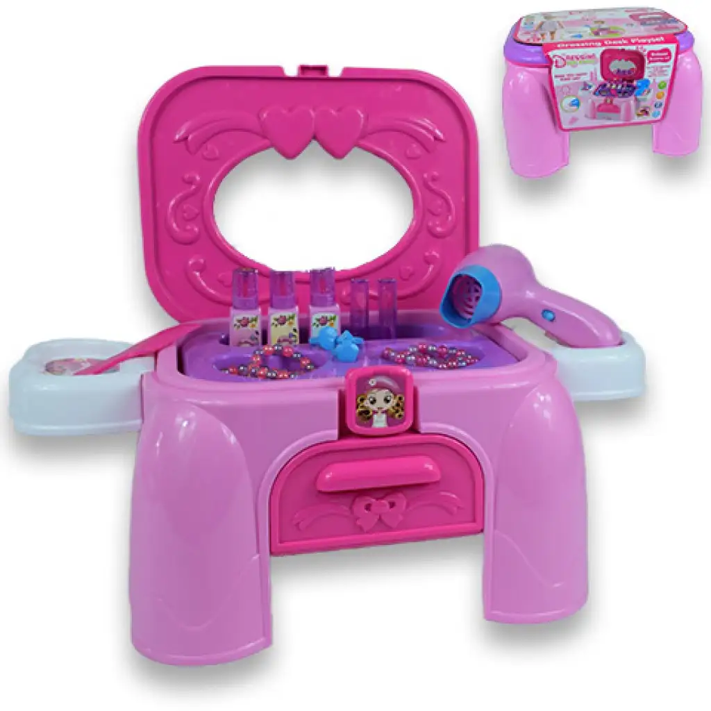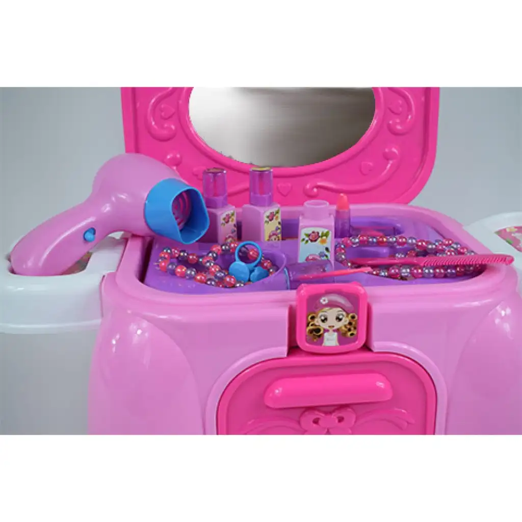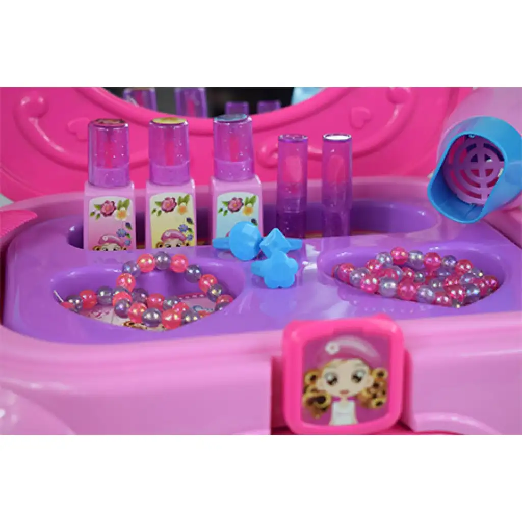 Szépítkező asztal hordozható ülőkében ékszerekkel és szépség kiegészítőkkelSzépítkező asztal hordozható ülőkében ékszerekkel és szépség kiegészítőkkel