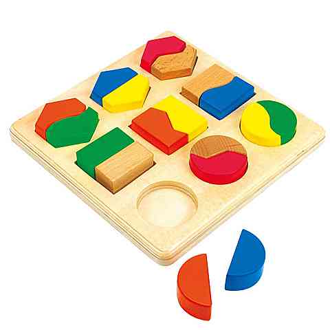 Igazi készségfejlesztő játék a legkisebbeknek, mely minőségi fa anyagból készült. A játék elemeit úgy kell a fa alapba illeszteni, hogy az tökéletesen belesüllyedjen a formába. ehhez a kicsik egy két fél elemet használhatnak, melyek között találnak színes és natúr fa elemeket is. A kilenc formába mind megkereshetik az elemeket, így fejlesztve a logikájukat, valamint megismerkedhetnek a formákkal és a színekkel is.