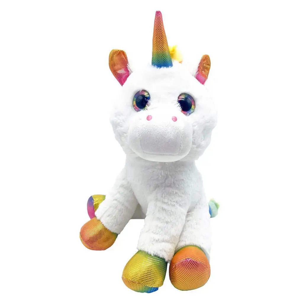Ez a szivárvány unikornis plüss egy varázslatos és mesés játék, amely 30 cm-es méretével lenyűgöző látványt nyújt. A fehér testű unikornisnak szivárványos patái, fülei és szarva van, valamint szeme csillogó szivárvány színű, ami igazán egyedi megjelenést kölcsönöz neki.