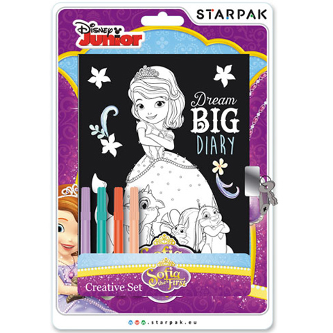 Szófia Hercegnő ezúttal egy kreatív napló kíséretében jelenhet meg otthonodban. A napló tartozékaként négy darab különböző színű filctollat is találhatsz melyekkel neked kell a napló borítóját kiszínezni. Engedd szabadjára a fantáziád és színezd ki Szófia hercegnőt a saját ízlésed szerint! A napló lakatos rázódásának köszönhetően megakadályozhatod, hogy illetéktelenek olvasgassanak a titkaidban. Egészítsd ki titkaidat rajzokkal és matricákkal, hogy teljesek legyenek legkedvesebb emlékeid története.