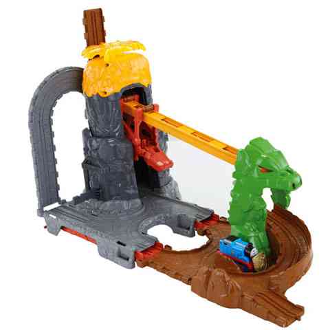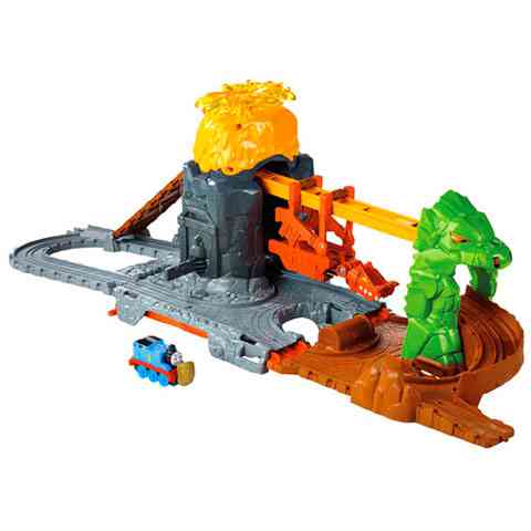 Izgalmas kaland várja Thomast a Sárkány-szigeten! Amikor Thomas egy pajzsot talál a Ködfátyol-szigeten, arra ösztönzi, hogy bátran felkutassa a legendás sárkányt a Sárkány-szigeten. Amint Thomas végigrobog a pályán Ködfátyolszigetről Sárkány-szigetre, kitör a vulkán, és Thomasnak menekülnie kell! Felrobog a rámpán, egyenesen a sárkányhídra. Vajon sikerül Thomasnak a drótkötélpályán visszaszáguldania biztonságosan Ködfátyol-szigetre? A játékszett könnyen összecsukható a tároláshoz és szállításhoz, és tartalmaz egy fém Thomast, egy vulkánt "kitörő" funkcióval, egy sárkányhidat drótpályával, hídpályát és hurokpályát. Izgalmas fények és hangok egészítik ki a mókát!