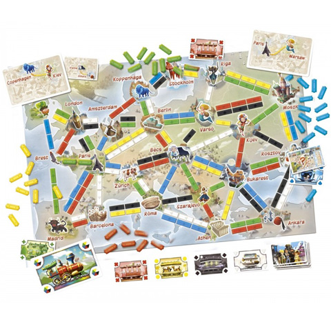 A Ticket to Ride egy nagyon népszerű és izgalmas társasjáték, amit most akár a hat éves korosztály is kipróbálhat, hiszen ez egy kifejezetten gyerekek számára fejlesztett változat egyszerűbb játékszabályokkal, és barátságosabb térképpel. Gyűjtsd össze a színes vagonokat, hogy elegendő egyforma kártyád legyen ahhoz, hogy megépítsd belelő az első vasútvonalat két város között. Építs ki egy hosszabb, több város összekötő vonalat, ami az egyik jegyeden látható. Aki a legokosabban építkezik, és a legtöbb jegyen látható útvonalat tud megépíteni, az nyeri a játékot.