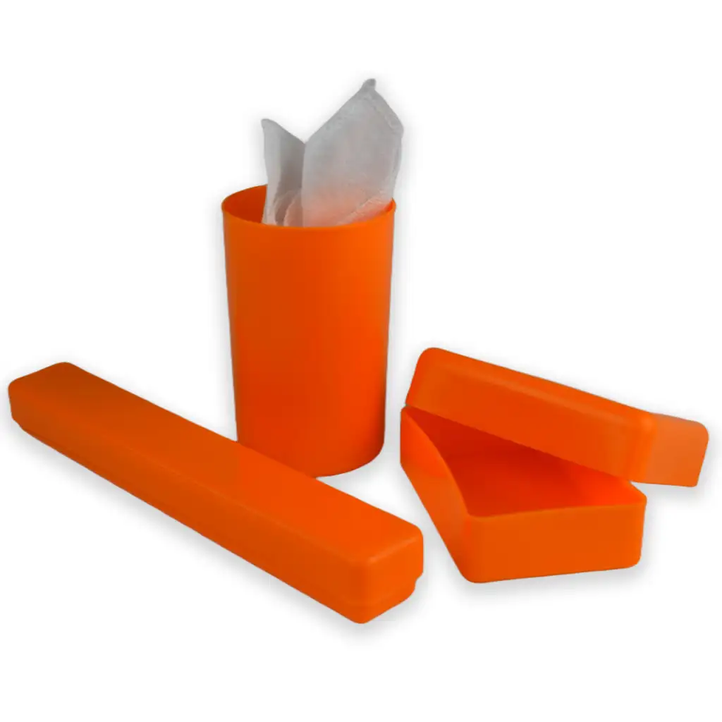A csomag tartalmaz egy piros fogkefetartót, amely praktikus és higiénikus módot biztosít a fogkefe tárolására. A tartó segítségével a fogkefe tisztán és rendezett módon tartható, megakadályozva, hogy a fogkefe szennyeződjön vagy elveszítse a sörtéinek formáját.