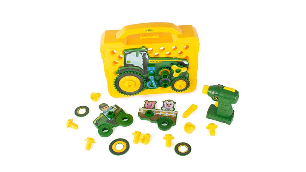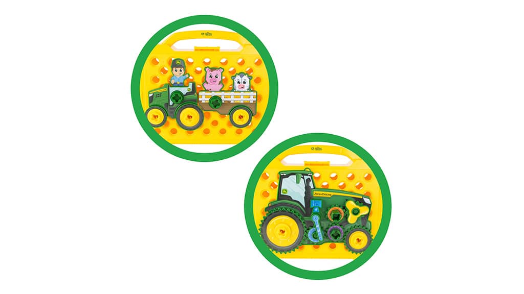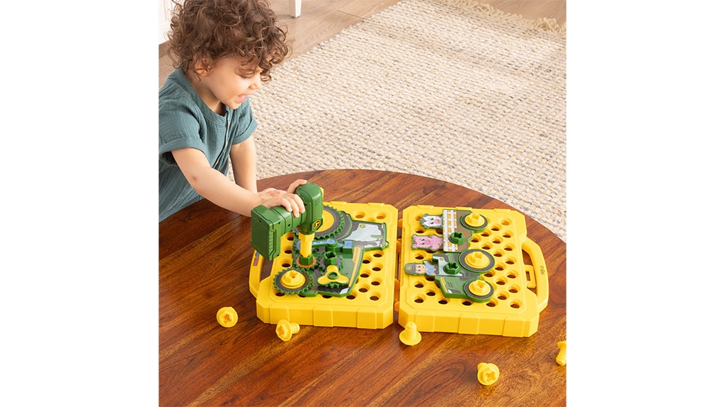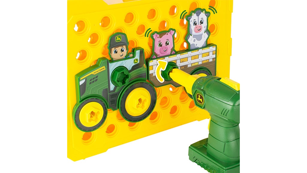 A TOMY elhozza a farm élményét a gyerekszobába a John Deere Build-A-Buddy Activity Board játékkal! Ez a játékkészlet lehetővé teszi, hogy a 18 hónapos és annál idősebb kisgyermekek két különböző traktoros farmjelenetet építsenek színes csavarok, csavaranyák, kerekek és traktor alkatrészek segítségével. A gyerekbarát fúróval a kicsik mozgathatják a traktorokon található figurákat, köztük egy farmert, egy tehenet és egy malacot fel-le. A játéktábla laposan fekszik, és két oldala van, így változatosan lehet vele játszani. A gyerekek a mellékelt matricákkal díszíthetik a kerekeket és a traktor alkatrészeket, majd megépíthetik és kipróbálhatják saját farmjukat. Ez a játék nemcsak kreativitást és finommotorikus készségeket fejleszt, hanem órákon át tartó szórakozást is nyújt a legkisebbeknek!