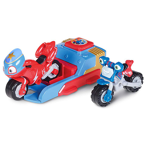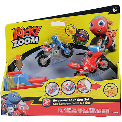 A gyerekek most végre valóban csatlakozhatnak a kedvenc mese szereplőjükhöz ennek a nagyszerű Ricky Zoom kilövő szettnek a segítségével, ami mindjárt két motort is tartalmaz. A csomagban természetesen a mese legnépszerűbb motorjai kerültek bele Loop és Ricky személyében, és mindketten készen állnak egy különleges kalandra. A gyerekeknek nincs más dolguk, mint a kis motort elhelyezni a kilövő szerkezetben, és amikor szén állnak, csak megnyomják a gombot, és a motor azonnal útjára indul. Mindkét motor olyan különleges gumikat kapott, amivel könnyedén megőrzik az egyensúlyukat, és képesek messzire elgurulni anélkül, hogy eldőlnének.
