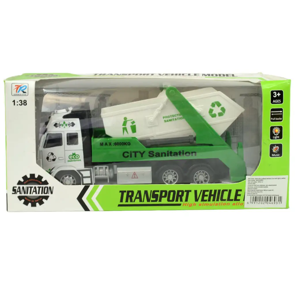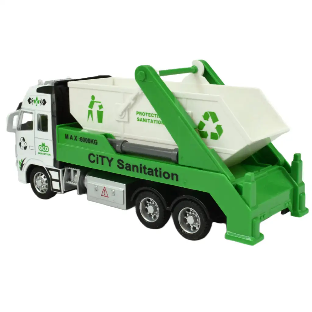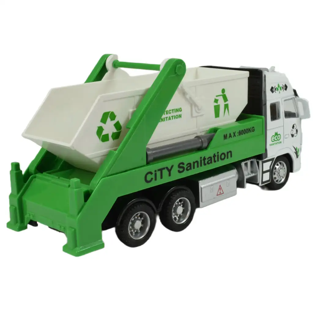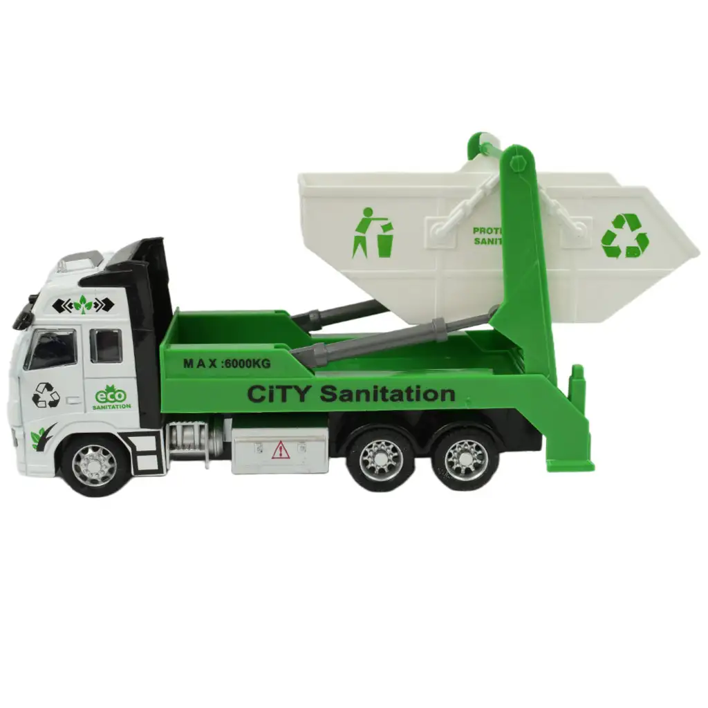 Ez az újrahasznosítható hulladékot gyűjtő és szállító konténeres szemétszállító autó valódi környezettudatosságot tükröz, ami kiváló üzenetet közvetít a gyerekek számára. A teherautó oldalán büszkén látható az újrahasznosítás emblémája, ami rávilágít arra, hogy a hulladék újrahasznosítása fontos és felelősségteljes tevékenység. A fehér és zöld színű jármű nemcsak látványos, de praktikus is, hiszen könnyedén le- és felemeli a konténert, így az újrahasznosítás folyamata is egyszerűbbé válik.