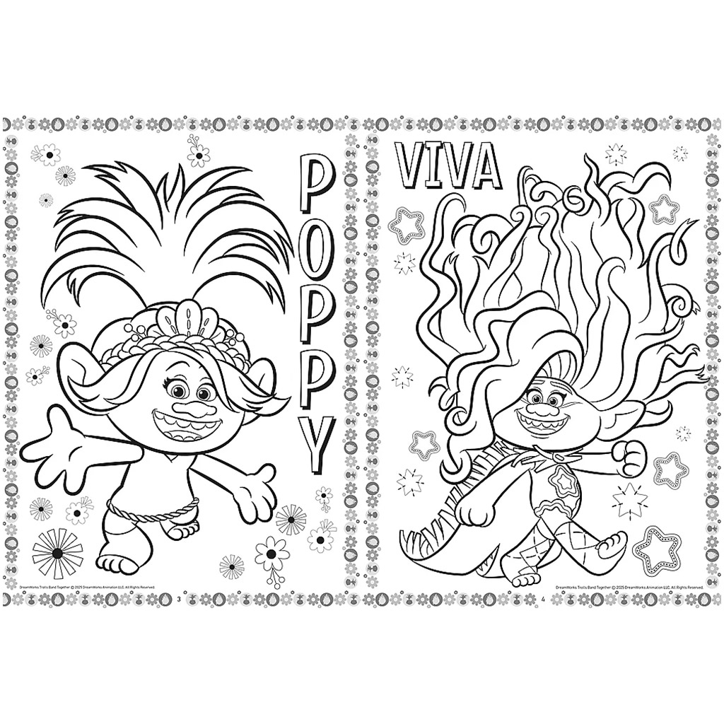 Trollok: Együtt a banda tematikájú színezőkönyv Poppyval és Vivával