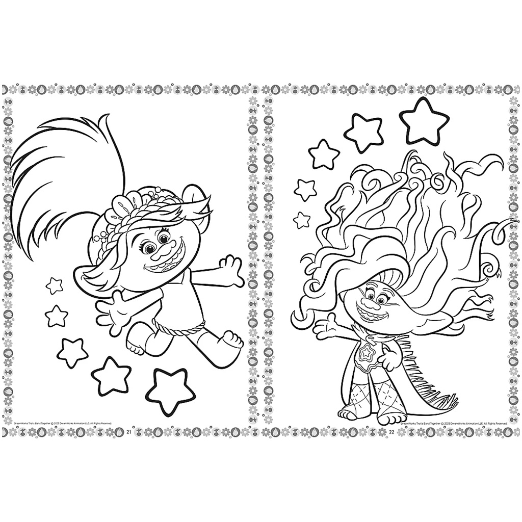 A kifestő lapjain a trollok különféle pózokban, mókás jelenetekben és csillagokkal, virágokkal, díszített hátterekkel jelennek meg. A Poppy és Viva nevével ellátott oldalak játékosan fejlesztik a betűfelismerést és olvasási készséget is. A részletgazdag, mégis könnyen színezhető illusztrációk tökéletesek már óvodás korú gyermekek számára is – miközben a kézügyesség, koncentráció és színérzék is fejlődik.