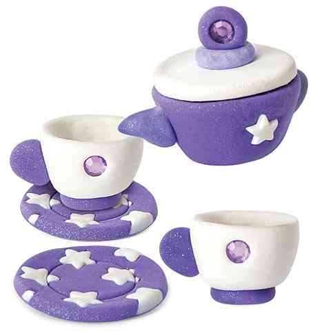 Készítsd el a saját teás szettedet a játékhoz! A kreatív Twinkle Clay agyagozó szettben a kislányok két csomag agyagot is találnak, melyeknek lila és fehér színe mellett csillámot is tartalmaz az anyaga, így még látványosabb lesz formázás után. A formázó elemekkel elkészíthetik a teás kancsót és a csészéket is, így száradás után máris meredezhetik a saját tea partijukat. A lila és fehér színek tökéletesen harmonizálnak, az elkészült alkotásokat pedig ékkövekkel is dekorálhatják a gyerekek!