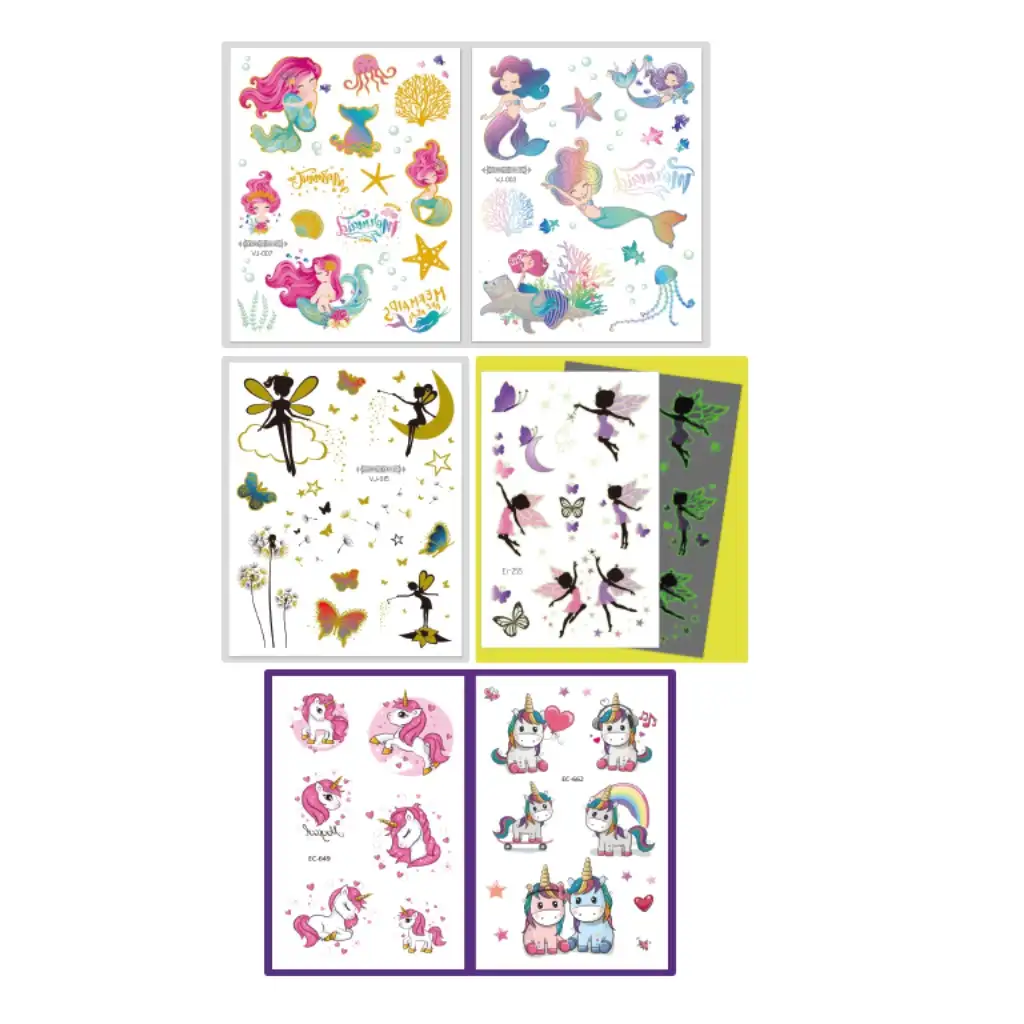 Ezek a tetoválások kifejezetten gyermekbarátok: már 3 éves kortól biztonságosan használhatók, és 4 évesen a gyerekek akár maguktól is képesek feltenni őket. A felrakásuk pofonegyszerű: csak vágd ki a kívánt mintát, távolítsd el a védőfóliát, helyezd a bőrre, majd egy vizes szivaccsal töröld át. Így a csodás, varázslatos tetoválásod pillanatok alatt készen áll a kalandra! Bátran engedd szabadjára a gyermeked képzeletét ezzel a bájos, tündéri és pónis tetkó szettel.