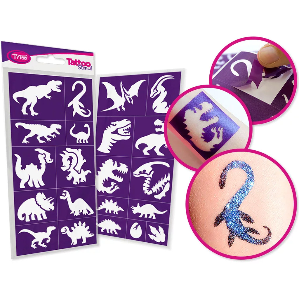 A szettben megtalálhatóak a legismertebb és legkedveltebb dinoszauruszok, mint a T-Rex, Stegosaurus, Triceratops vagy Brontosaurus, de különleges, mesébe illő formák és „rajzfilmes” figurák is helyet kaptak a kollekcióban. A sablonok öntapadós hátoldallal rendelkeznek, így könnyen rögzíthetők a bőrre, és precíz, tiszta mintát biztosítanak. A csillámtetoválás elkészítése egyszerű: csak helyezd fel a sablont, szórd rá a csillámport, majd távolítsd el a fóliát – már kész is a színes őslény!
