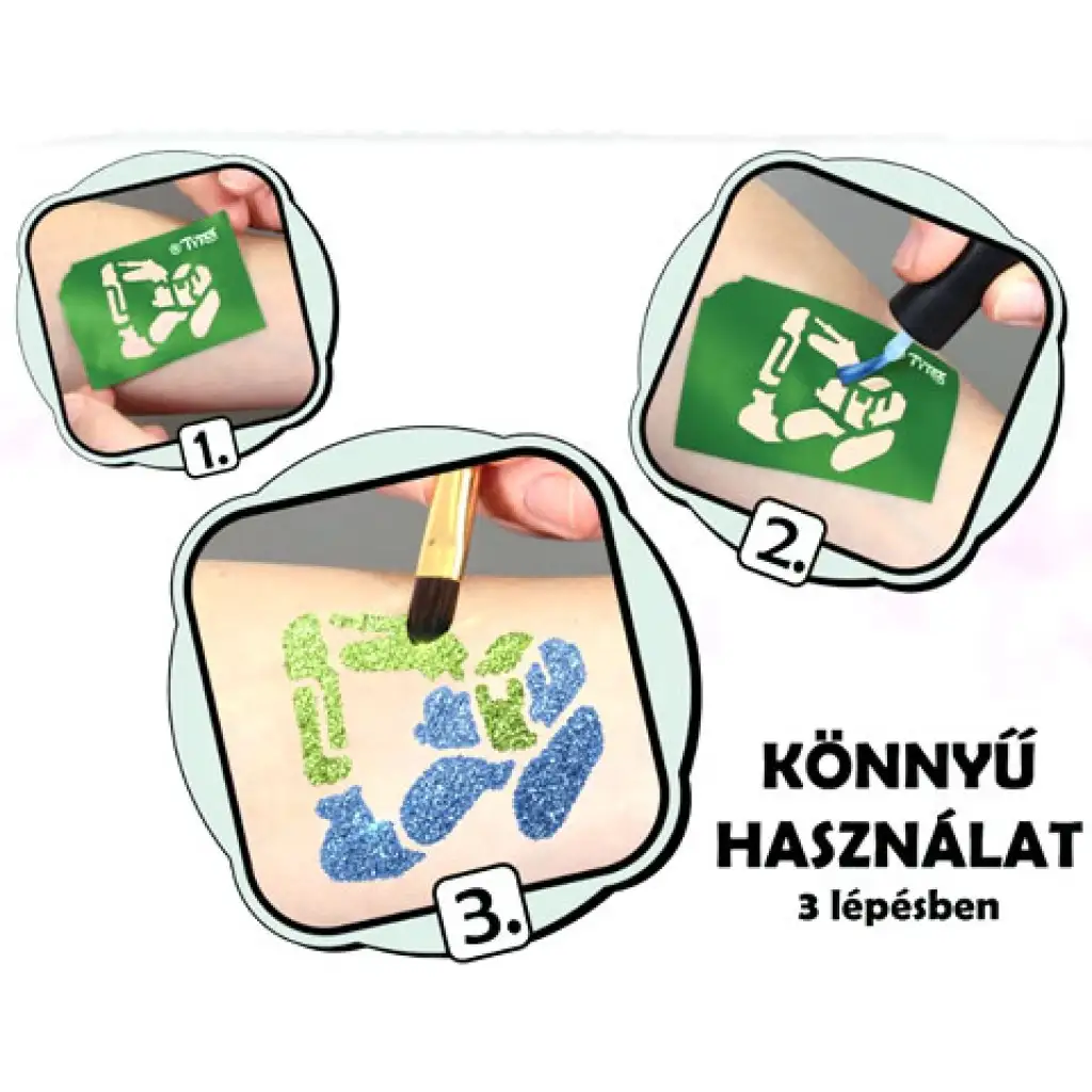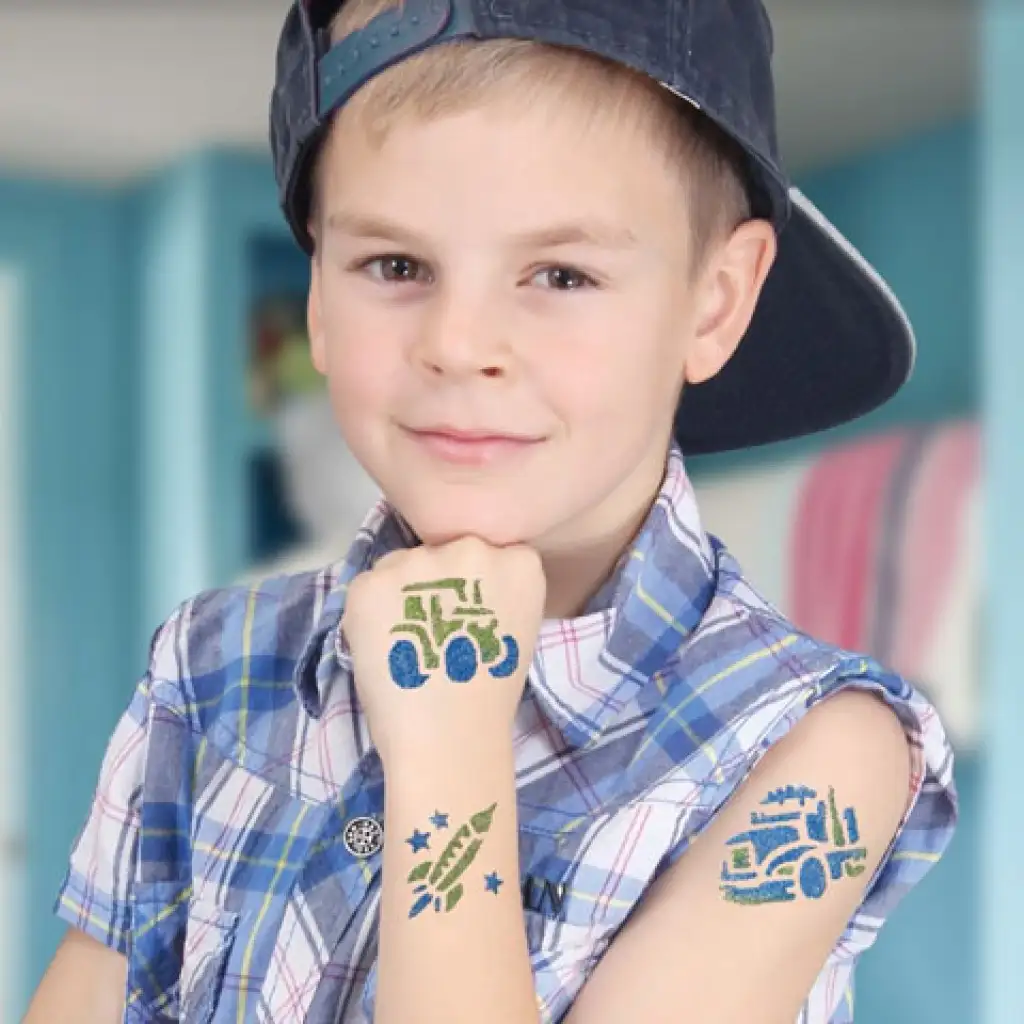 A csillámtetoválások nagyon jól tudnak kinézni, melyet fiúk is nyugodtan magukra tehetnek, hiszen nagyon vagány mintákat is találhatunk, ugyancsak vadján színekkel. Ebben a szettben különböző járművek mintái találhatóak meg, melyek lehetnek autók, repülők vagy munkagépek is. A szettben egy zöld és egy kék színű csillámpor található meg, melyek kifejezetten jól fednek, így tökéletes eredményt érhetünk el vele. A szettben a 15 db minta mellett ragasztót és ecsetet is találsz, agy minden megvan a tökéletes tetováláshoz.