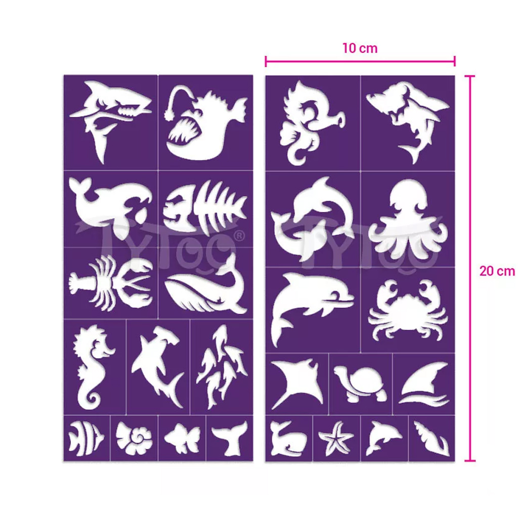 A szett változatos mintái között megtalálhatóak cápák, ráják, polipok, delfinek, tengeri csillagok, rákok, sellők és még sok más tengeri élőlény. A sablonokat egyszerűen fel lehet ragasztani a bőrre, majd csillámporral vagy testfestékkel kitölteni – és már kész is az egyedi, csillogó tengeri tetkó! A minták nemcsak aranyosak és ötletesek, hanem szuper részletgazdagok is, így a végeredmény mindig látványos lesz.