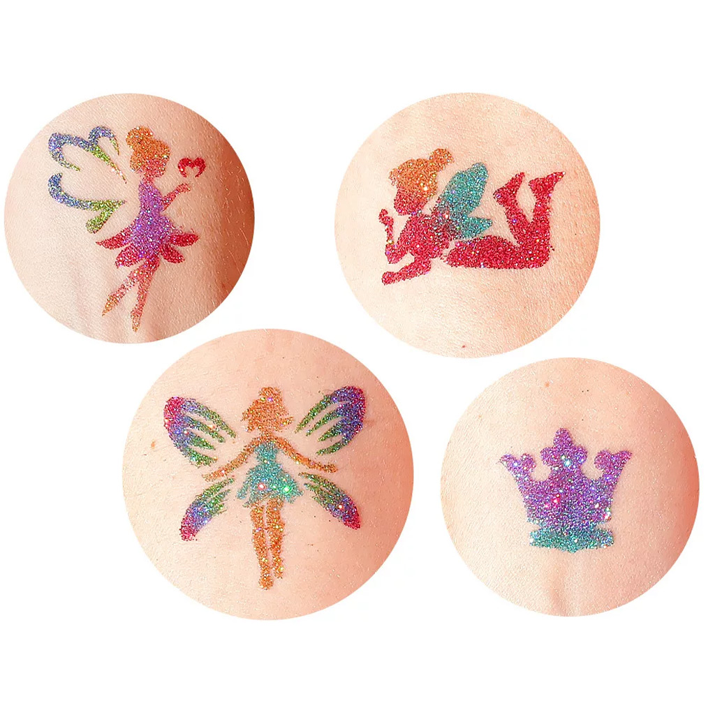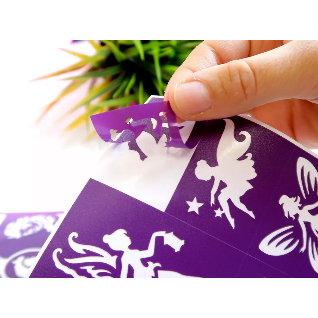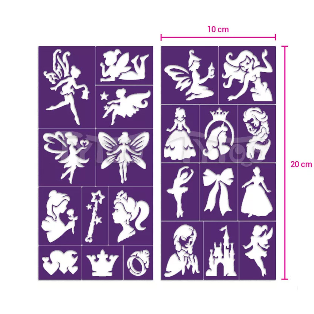 Ez a sablonszett tökéletes választás minden kis álmodozónak, aki szívesen bújik tündérszárnyak mögé vagy képzeli magát egy mesehős hercegnő bőrébe. Az öntapadós sablonokat könnyedén felhelyezhetitek a bőrre, és csillámporral vagy testfestékkel kiegészítve igazán látványos, színes és csillogó tetkókat alkothattok. A ragasztó jól tapad, de nem irritálja a bőrt, így biztonságos a használat kisebb gyerekek számára is.