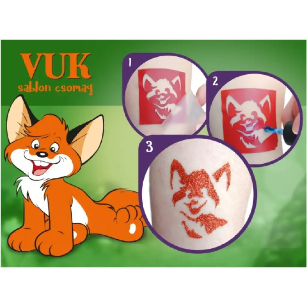 A Fekete István regénye nyomán készített Vuk című rajzfilm mai napig hatalmas népszerűségnek örvend. Ez a fantasztikus 3db-os csillámtetoválás sablon szett a mese három kedvelt karakterét, Vuk-ot, cselét és Unkát mintázza. Vuk a mese főszereplője, a kedves kis rókakölyök, Csele Vuk barátnője, Unka pedig az ugri-bugri béka, akivel Vuk az erdőben találkozik. A csillámtetoválás sablon egyszerűen használható, köszönhetően öntapadós kialakításának. A bőrre könnyedén feltapad és a tetoválás elkészültéig tökéletesen mozdulatlan marad, majd nyom nélkül eltávolítható. A szett kizárólag a 3db öntapadós sablon tartalmazza, a tetoválások elkészítéséhez szükséges ragasztóanyag és csillámpor külön kapható.