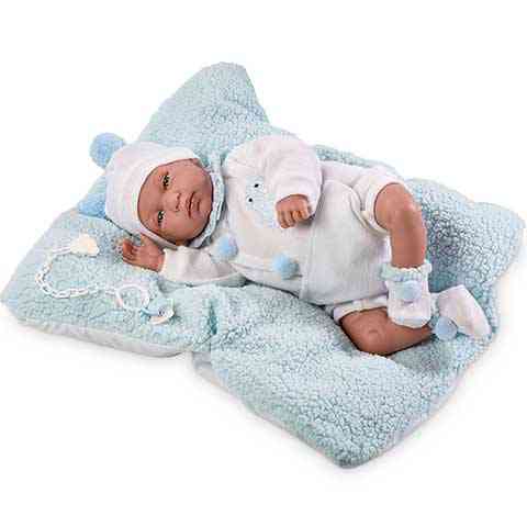 Hát nem nyújt szívmelengető látvány ez az újszülött fiú baba? A Llorens spanyol gyártmányú terméke ezúttal is a legjobb minőséget képviseli. A baba bájos pofija, és kék szeme mellett testének aprólékos kidolgozása teszi őt szerethetővé, így biztos lehetsz benne, hogy kislányod kedvenc játszópajtásává válik egy pillanat alatt. Rugdalódzójának, sapkájának, és zoknijának bojtjai kék színűek, mely feldobja a világos árnyalatú ruhadarabokat. A bundás, puha takaró, illetve a macis cumi elengedhetetlen kelléke az újszülött nyugodt pihenésének.