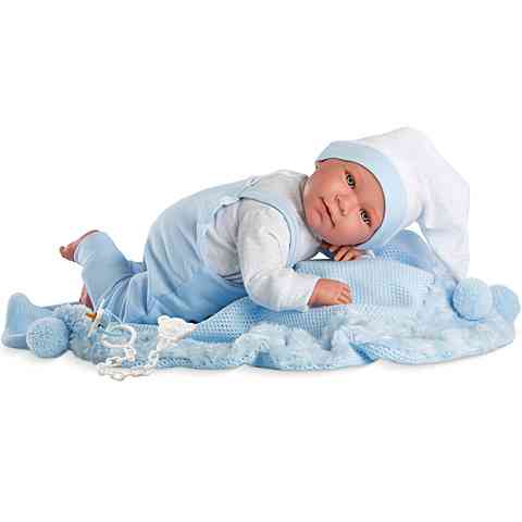 Kantáros kék színű nadrágban érkezik hozzád ez a bájos kisbaba, akinek ruhája csillaggal díszített. A kék színű takaróra ültethető baba fejére manósapkát húzhatsz, amivel még kedvesebb a megjelenése. A macis cumit a baba ruhájára csíptetheted, kezeit és lábait, valamint fejét is mozgathatod. Legyen játszótársad a bájos újszülött csecsemő, melynek rendkívül élethű megjelenése még inkább feldobja a játékélményt.