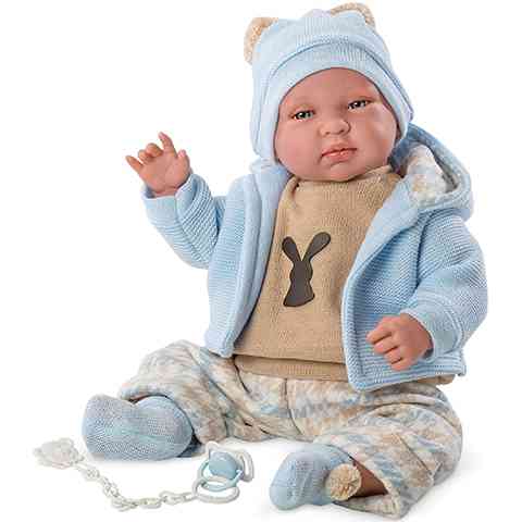 Kifejező mimikával, és rendkívül részletgazdag kidolgozással alkották meg a Llorens babákat, melyek közül rengeteg féle típust, illetve méretet találsz webshopunk széles kínálatában. Az újszülött fiú baba tündéri pofija, kék szeme, illetve apró kezei le fognak nyűgözni, gyermeked pedig nem is akarja majd kiengedni ölelő karjai közül. A baba nyuszi mintás pulóverére kék színű kapucnis kardigánt húzhatsz, mely színben harmonizál a gyerkőc sapkájával, nadrágjával, és meleg kötött zoknijával is.