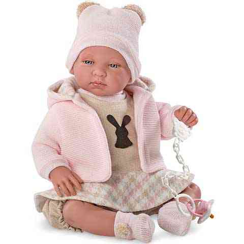 A spanyol Llorens babák a legapróbb részletekig hasonlítanak a valóságos kisgyermekekre, ezért, ha szeretnéd kislányodat meglepni egy élethű babával, a legjobb helyen jársz. A 44 cm-es újszülött lány baba tekintete láttán olvadozni fogtok, kislányod pedig folyton ölelő karjai között akarja majd tudni új játszótársát. A baba kötött kardigánja, sapkája, és zoknija színben tökéletesen illik a mintás szoknyához, utóbbi kettőn pedig még a bojt is megegyezik. A gyönyörű újszülött kislány baba stílusos öltözete mellett egy maci mintás cumit is kaptok a szettben, mely ruhára csíptethető.