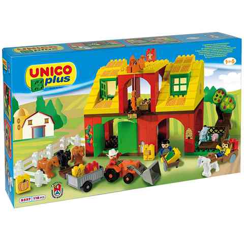 A vidéki farmon egy pillanatra sem állhat meg a munka. A farmer két segítőjével reggeltől estik szorgoskodik az állatok körül. A lovaknak takarmányra van szükségük, a betakarított terményeket pedig el kell helyezni a padláson, ahová a daru segítségével kerülhetnek fel a dolgok. A traktor, a lovaskocsi, de még a kézi talicska sem pihenhet egy percre sem. Az Unico építőkockák kiválóan fejlesztik a gyerekek kreativitását, és a nagy méretű építőelemeknek köszönhetően már a legkisebbek is megismerkedhetnek ezzel a nagyszerű játékkal. Természetesen az építőelemek kompatibilisek egymással, így a az egyes készletek szabadon kombinálhatók egymással.