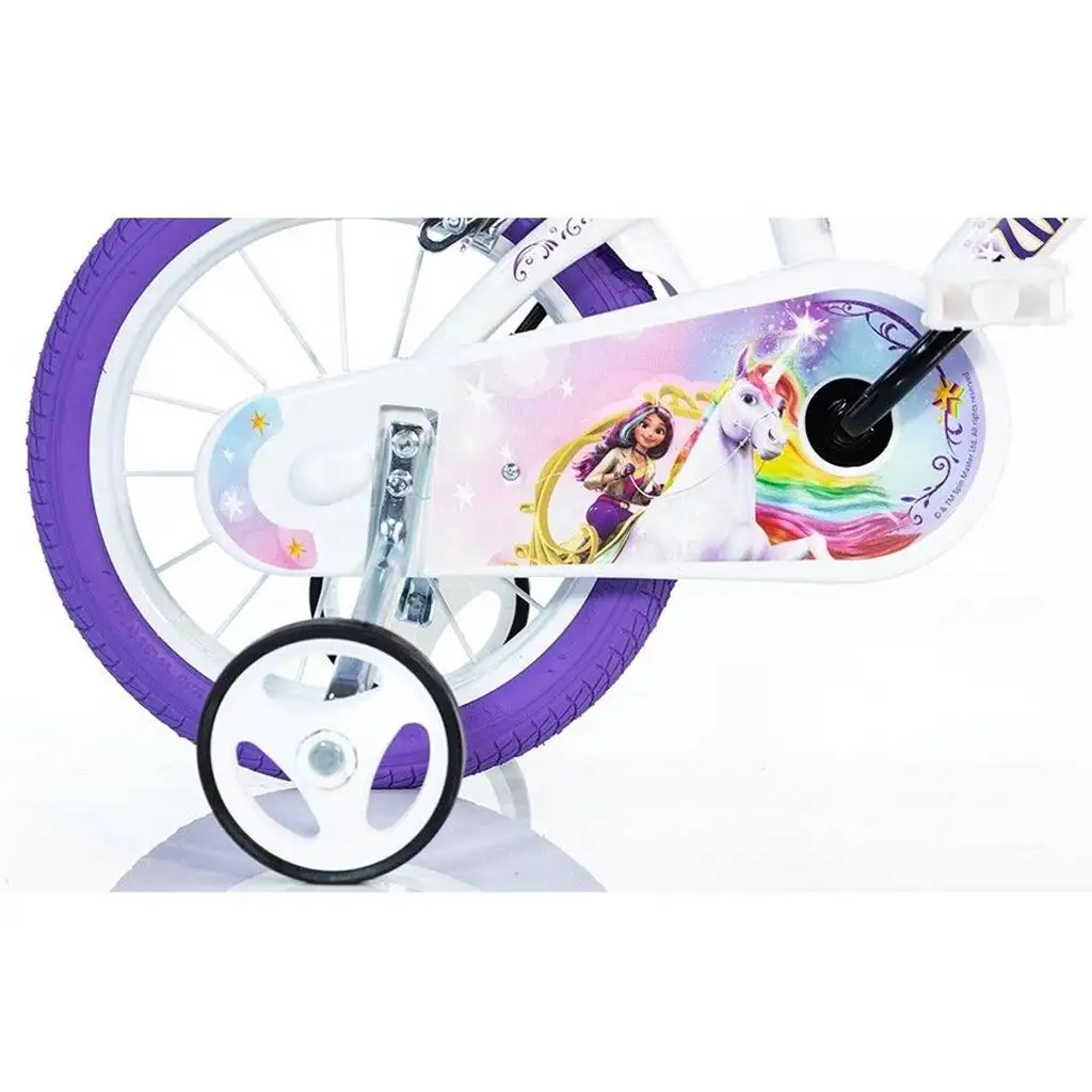Unicorn Academy 16” gyerek bicikli kosárral és babaüléssel lila-fehér színben – Dino Bikes kerékpár
