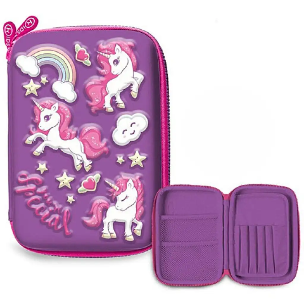 Különleges mintázattal ellátott tolltartóval kezdhetik meg az iskolát a kislányok, hiszen ez a tolltartó háromdimenziós dekorációval rendelkezik. Az unikornisos és szivárványos motívumok kidomborodnak a tolltartó felületéből, így igazán tetszetős külsőt kölcsönöznek az iskolai kiegészítőnek. A dupla cipzárral ellátott tolltartóban minden iskolában szükséges írószer helyet kaphat, és szállításuk is biztonságban történhet.