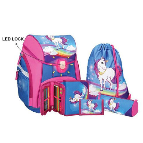 Egy igazán különleges iskolatáskát szerezhetsz be gyermekednek, melyben több kiegészítő is megtalálható, amire szükség lehet az iskolában. A hátizsák ergonomikus, párnázott kialakítást kapott, mely nagyon kényelmes viseletet biztosít. A hátizsák oldalt és elől is cipzáras zsebekkel rendelkezik, amikben apróságokat lehet tárolni, nagy rekeszében pedig minden írószer elfér majd, amire szüksége lehet. Ezen kívül a táska fényvisszaverő csatot és elemeket is kapott, melyből az előbbi piros LED fénnyel tud égni, így sötétedés után biztonságos közlekedést biztosít. A táskában egy pénztárca is megtalálható, melyben minden irata és a zsebpénze is elfér majd, valamint egy tornazsák is, amiben az egész testnevelés felszerelése kényelmesen belefér. Két tolltartó is a szett része, melyek közül az egyik egy bedobálós tolltartó, mely rajzórához és kiegészítő írószerek tárolásához kiváló választás lehet, a másik pedig egy kihajtható tolltartó, amiben gumiszalagok segítségével lehet rögzíteni az írószereket.