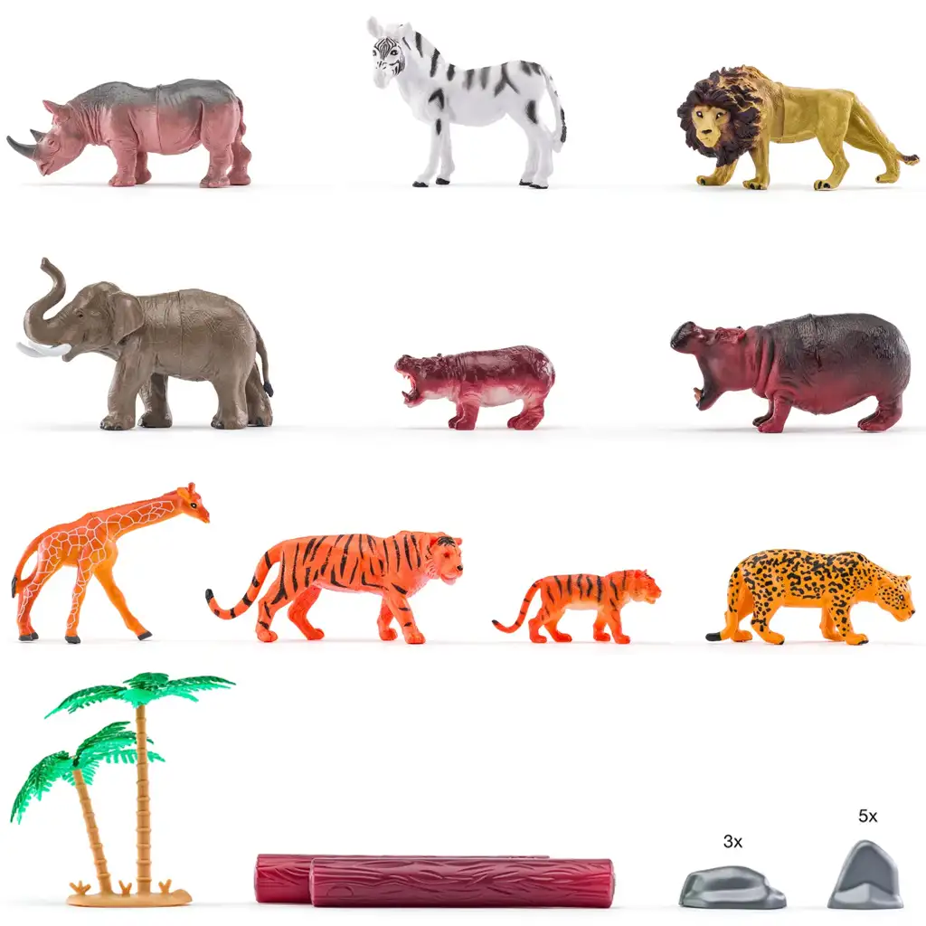 A szettben megtalálhatók a legismertebb vadállatok, például az erős és fenséges oroszlán, a gyors gepárd, a csíkos tigris, a hatalmas elefánt, a különleges mintázatú zebra és a hosszú nyakú zsiráf. Ezek az állatfigurák részletes kidolgozásuknak köszönhetően élethűek, így a gyerekek könnyedén felismerhetik és megtanulhatják az állatok nevét és jellemzőit. A készletben található műanyag fák és sziklák pedig segítenek a gyerekeknek megteremteni a vadon hangulatát, így még kreatívabbá tehetik a játékot.