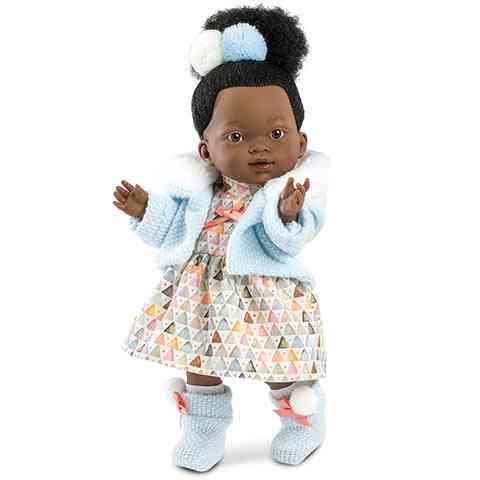 A színes háromszögekkel díszített ruhácska, a halvány kék színű lábbeli és kardigán együttesen kiemelik a baba csodaszép barna színét, ahogy a két pompon is nagyszerűen illik a baba sűrű fekete göndör hajához. A Llorens babák rendkívül részletgazdag kialakításnak köszönhetően valódi, élményekben gazdag játékélményt nyújtanak a gyerekeknek, amelyeket a cserélhető babaruhák tesznek még változatosabbá. Természetesen a babák műanyag részei mentesek mindenféle káros és allergén anyagtól.