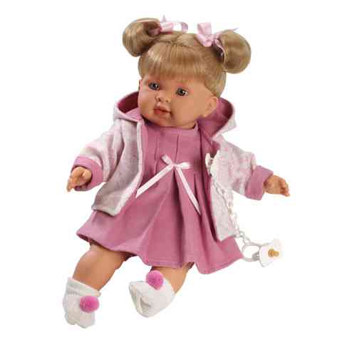 Az elegancia és báj netovábbja ez a csodás, mályva színű ruhában pompázó baba. A ruhát a mellkasnál levarrt berakások, és szatén masni teszi igazán elegánssá. A kabátka bélése ugyan olyan mályva színű, mint a ruha, így tökéletes az összhatás. A kabát apró mintázata és a zoknin látható pom-pom teszi vidámmá ezt a csodás, elegáns ruházatot. A babát a tetében elhelyezett készülék teszi képessé a sírásra, melyet azonnal abba hagy, amint a cumi a szájába kerül, pont ugyan úgy, mint az igazi babák. A baba végtagjai és a részletekben gazdag fej gyermekbarát, minőségi műanyagból készültek.
