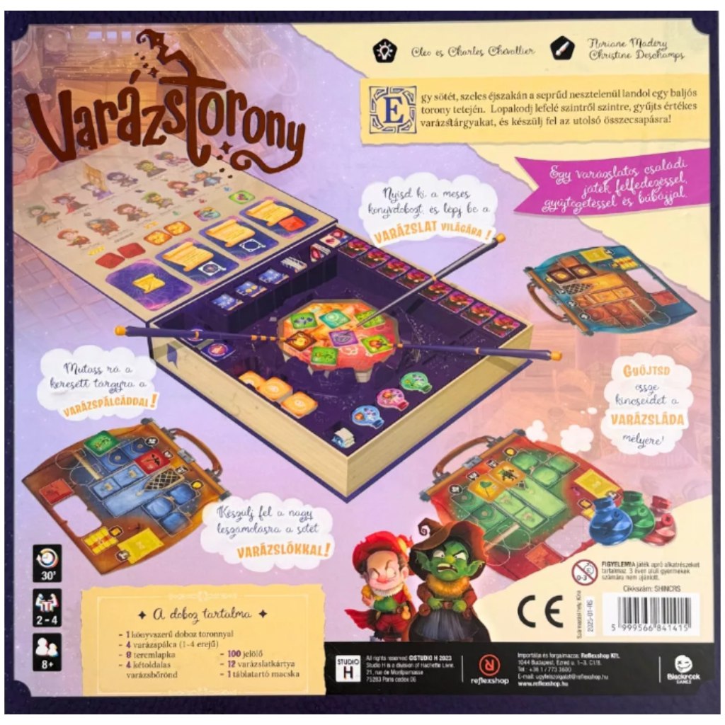 A Varázstorony egy mesés könyvdobozba rejtett, könnyen tanulható, mégis taktikus társasjáték, ahol egy titkokkal teli, baljós toronyban kalandoztok. Szintről szintre lopakodva termeket kutattok át, értékes varázstárgyakat gyűjtötök, és közben felkészültök a kriptában váró végső összecsapásra a sötét varázslókkal. Minden körben kiválasztjátok a megszerezni kívánt jelölőt, majd egyszerre mutattok rá varázspálcátokkal – a jó időzítés és a kockázatvállalás jutalma arany, összetevők, fegyverek és varázslatok formájában érkezik.